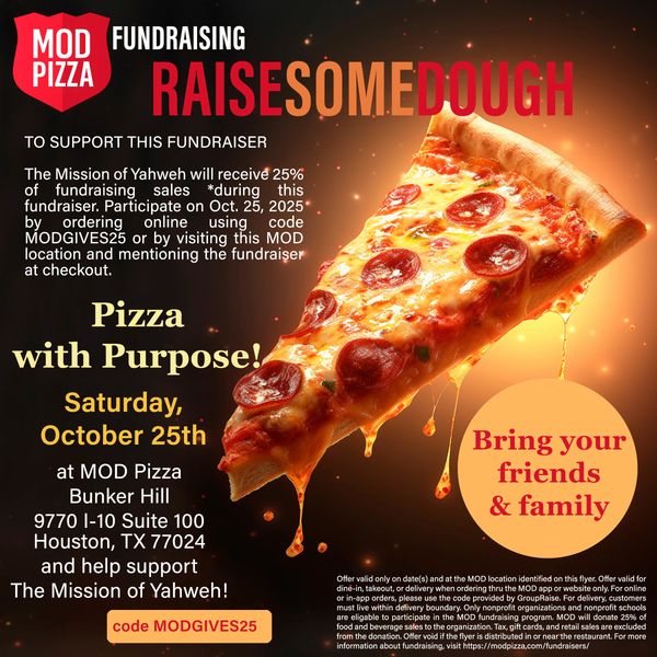 Enjoy a meal that makes a difference! When you dine at MOD Pizza during our all day fundraising event, 25% of your purchase will go directly to supporting The Mission of Yahweh and the women and children we serve.