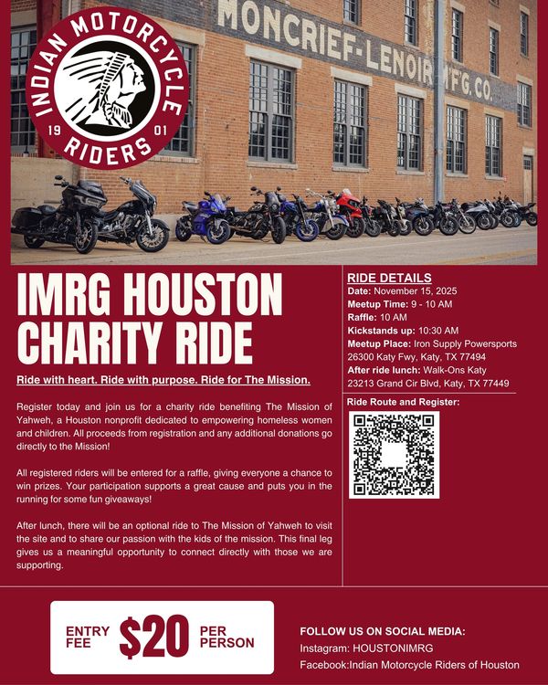 Join the Indian Motorcycle Riders Houston Chapter 2010 for an unforgettable charity ride benefiting The Mission of Yahweh.